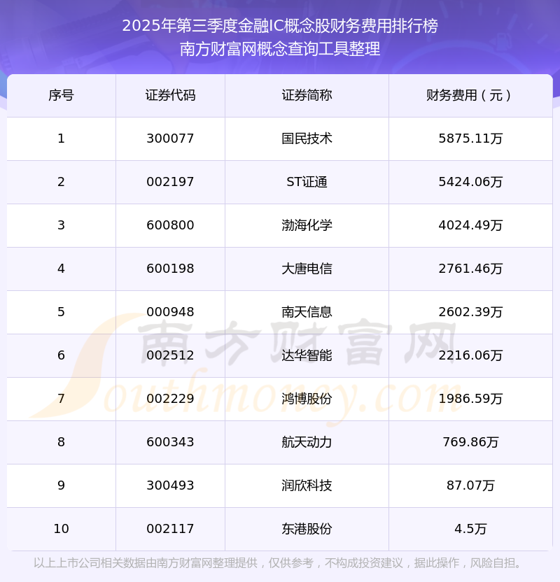 2025年第三季度,金融IC概念股財(cái)務(wù)費(fèi)用排行榜中,國民技術(shù)(300077)財(cái)務(wù)費(fèi)用總額高達(dá)5875.11萬,ST證通(002197)和渤;瘜W(xué)(600800)位居第二和第三,大唐電信(600198)、南天信息(000948)、達(dá)華智能(002512)、鴻博股份(002229)、航天動(dòng)力(600343)、潤欣科技(300493)、東港股份(002117)進(jìn)入前十,財(cái)務(wù)費(fèi)用總額分別排名第4-10名。