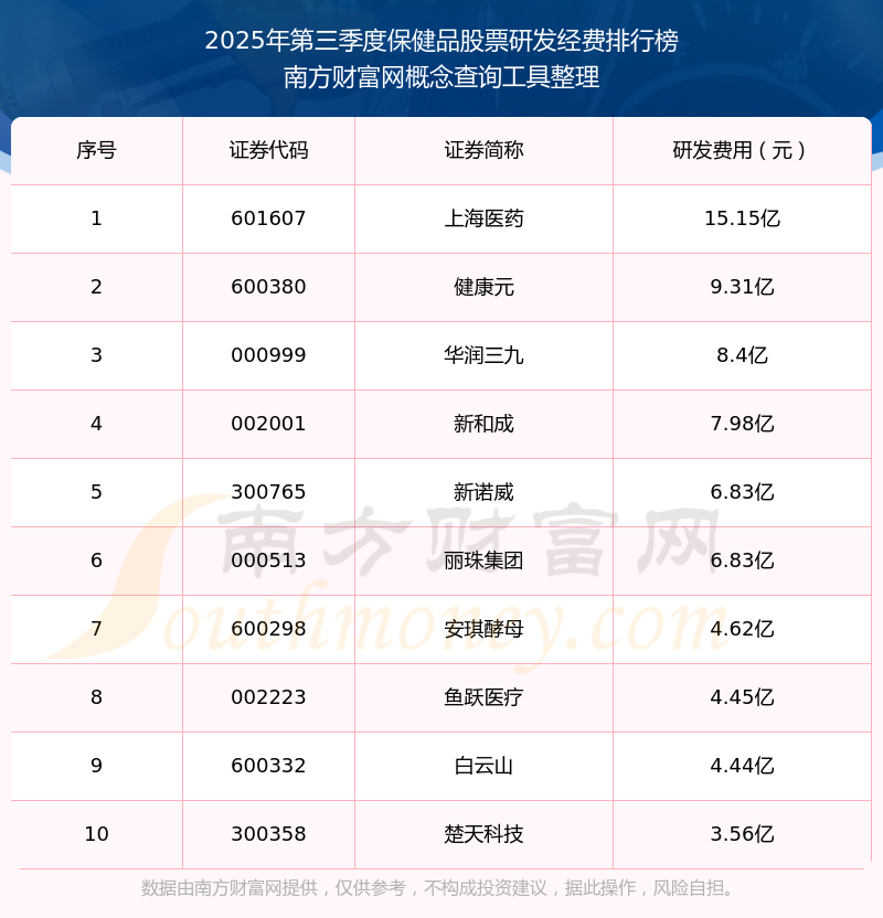 2025年第三季度保健品股票研發(fā)經(jīng)費(fèi)排行榜如下:上海醫(yī)藥(601607)研發(fā)經(jīng)費(fèi)總額高達(dá)15.15億,健康元(600380)和華潤三九(000999)分別位居第二和第三,新和成(002001)、新諾威(300765)、麗珠集團(tuán)(000513)、安琪酵母(600298)、魚躍醫(yī)療(002223)、白云山(600332)、楚天科技(300358)分別進(jìn)入前十,其研發(fā)經(jīng)費(fèi)總額分別排名第4-10名。