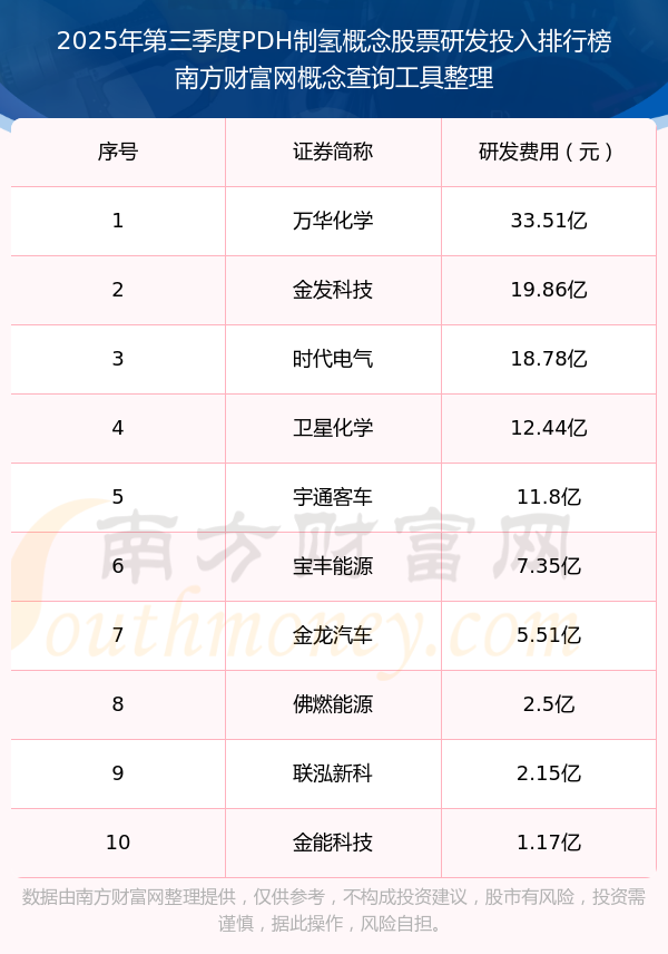 2025年第三季度,PDH制氫概念股票研發(fā)投入排行榜中,萬華化學(xué)(600309)研發(fā)投入總額高達33.51億,金發(fā)科技(600143)和時代電氣(688187)排名第二和第三,衛(wèi)星化學(xué)(002648)、宇通客車(600066)、寶豐能源(600989)、金龍汽車(600686)、佛燃能源(002911)、聯(lián)泓新科(003022)、金能科技(603113)進入前十,研發(fā)投入總額分別排名第4-10名。