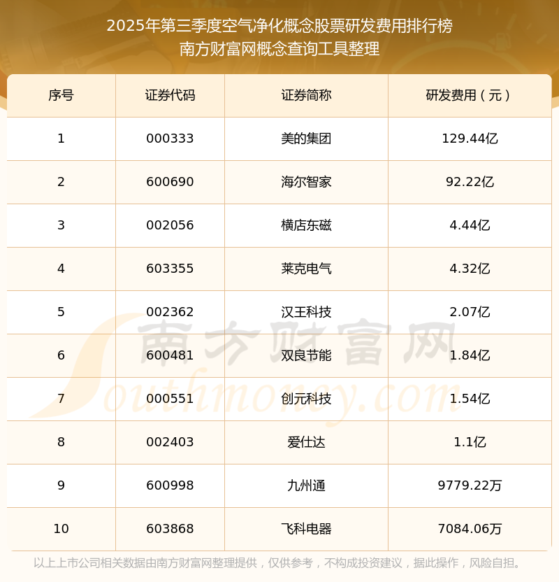 2025年第三季度,空氣凈化概念股票研發(fā)費用排名如下:美的集團(000333)研發(fā)費用總額高達(dá)129.44億,海爾智家(600690)和橫店東磁(002056)分別位居第二和第三,萊克電氣(603355)、漢王科技(002362)、雙良節(jié)能(600481)、創(chuàng)元科技(000551)、愛仕達(dá)(002403)、九州通(600998)、飛科電器(603868)分別進(jìn)入前十,其研發(fā)費用總額分別排名第4-10名。