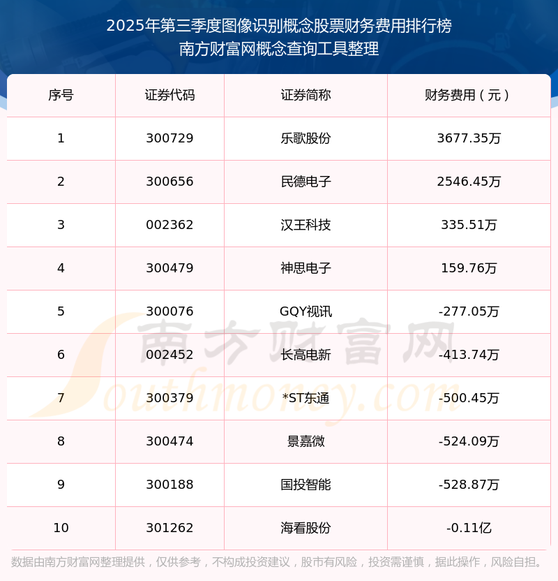 2025年第三季度,圖像識(shí)別概念股票財(cái)務(wù)費(fèi)用排名如下:樂歌股份(300729)的財(cái)務(wù)費(fèi)用總額高達(dá)3677.35萬,民德電子(300656)和漢王科技(002362)分別位居第二和第三,神思電子(300479)、GQY視訊(300076)、長(zhǎng)高電新(002452)、*ST東通(300379)、景嘉微(300474)、國(guó)投智能(300188)、?垂煞荩301262)分別進(jìn)入前十,其財(cái)務(wù)費(fèi)用總額分別排名第4-10名。