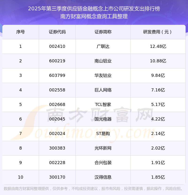 2025年第三季度,供應(yīng)鏈金融概念上市公司研發(fā)支出排行榜中,廣聯(lián)達(dá)(002410)研發(fā)支出總額高達(dá)12.48億,南山鋁業(yè)(600219)和華友鈷業(yè)(603799)位居第二和第三,巨人網(wǎng)絡(luò)(002558)、TCL智家(002668)、國光電器(002045)、ST易購(002024)、光環(huán)新網(wǎng)(300383)、合興包裝(002228)、漢得信息(300170)進(jìn)入前十,研發(fā)支出總額分別排名第4-10名。