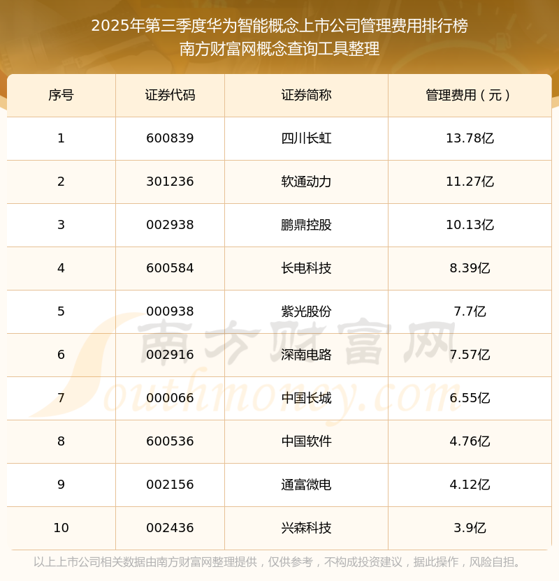 2025年第三季度,華為智能概念上市公司管理費用排行榜如下:四川長虹(600839)的管理費用總額高達(dá)13.78億,軟通動力(301236)和鵬鼎控股(002938)分別排名第二和第三,長電科技(600584)、紫光股份(000938)、深南電路(002916)、中國長城(000066)、中國軟件(600536)、通富微電(002156)、興森科技(002436)分別進(jìn)入前十,其管理費用總額分別排名第4-10名。