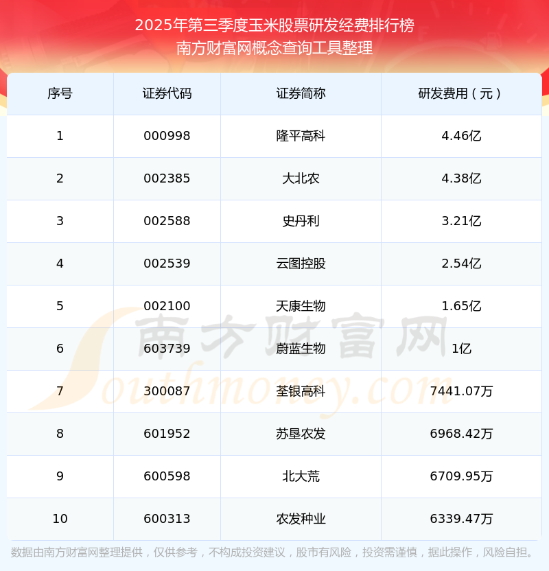 2025年第三季度,玉米股票研發(fā)經(jīng)費(fèi)排行榜中,隆平高科(000998)研發(fā)經(jīng)費(fèi)總額高達(dá)4.46億,大北農(nóng)(002385)和史丹利(002588)排名第二和第三,云圖控股(002539)、天康生物(002100)、蔚藍(lán)生物(603739)、荃銀高科(300087)、蘇墾農(nóng)發(fā)(601952)、北大荒(600598)、農(nóng)發(fā)種業(yè)(600313)進(jìn)入前十,研發(fā)經(jīng)費(fèi)總額分別排名第4-10名。