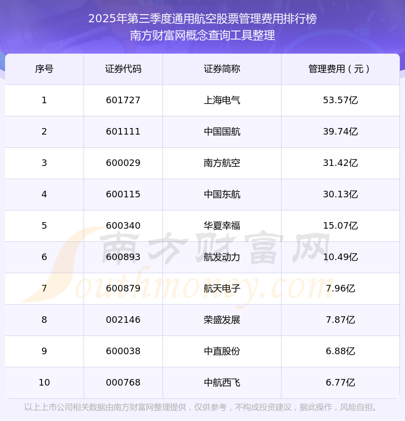 2025年第三季度,通用航空股票管理費用排名中,上海電氣(601727)的管理費用總額高達53.57億,中國國航(601111)和南方航空(600029)排名第二和第三,中國東航(600115)、華夏幸福(600340)、航發(fā)動力(600893)、航天電子(600879)、榮盛發(fā)展(002146)、中直股份(600038)、中航西飛(000768)進入前十,其管理費用總額分別排名第4-10名。