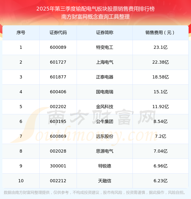 2025年第三季度,輸配電氣板塊股票銷售費用排行榜如下:特變電工(600089)的銷售費用總額高達23.1億,上海電氣(601727)和正泰電器(601877)分別排名第二和第三,國電南瑞(600406)、金風(fēng)科技(002202)、公牛集團(603195)、遠東股份(600869)、思源電氣(002028)、特銳德(300001)、天融信(002212)分別進入前十,其銷售費用總額分別排名第4-10名。