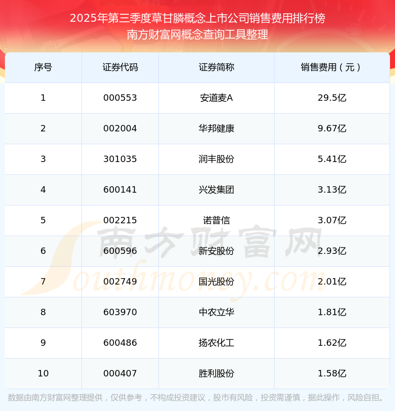 2025年第三季度,草甘膦概念上市公司銷售費用排行榜中,安道麥A(000553)銷售費用總額高達(dá)29.5億,華邦健康(002004)和潤豐股份(301035)位居第二和第三,興發(fā)集團(tuán)(600141)、諾普信(002215)、新安股份(600596)、國光股份(002749)、中農(nóng)立華(603970)、揚農(nóng)化工(600486)、勝利股份(000407)進(jìn)入前十,銷售費用總額分別排名第4-10名。