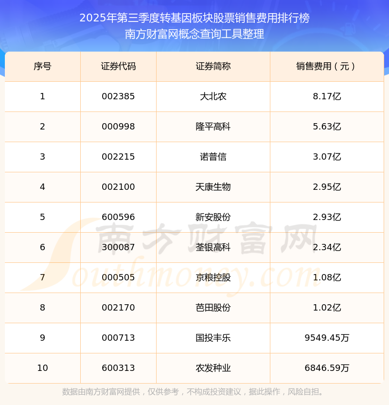 2025年第三季度,轉(zhuǎn)基因板塊股票銷售費(fèi)用排行榜如下:大北農(nóng)(002385)的銷售費(fèi)用總額高達(dá)8.17億,隆平高科(000998)和諾普信(002215)分別位居第二和第三,天康生物(002100)、新安股份(600596)、荃銀高科(300087)、京糧控股(000505)、芭田股份(002170)、國(guó)投豐樂(lè)(000713)、農(nóng)發(fā)種業(yè)(600313)分別進(jìn)入前十,其銷售費(fèi)用總額分別排名第4-10名。