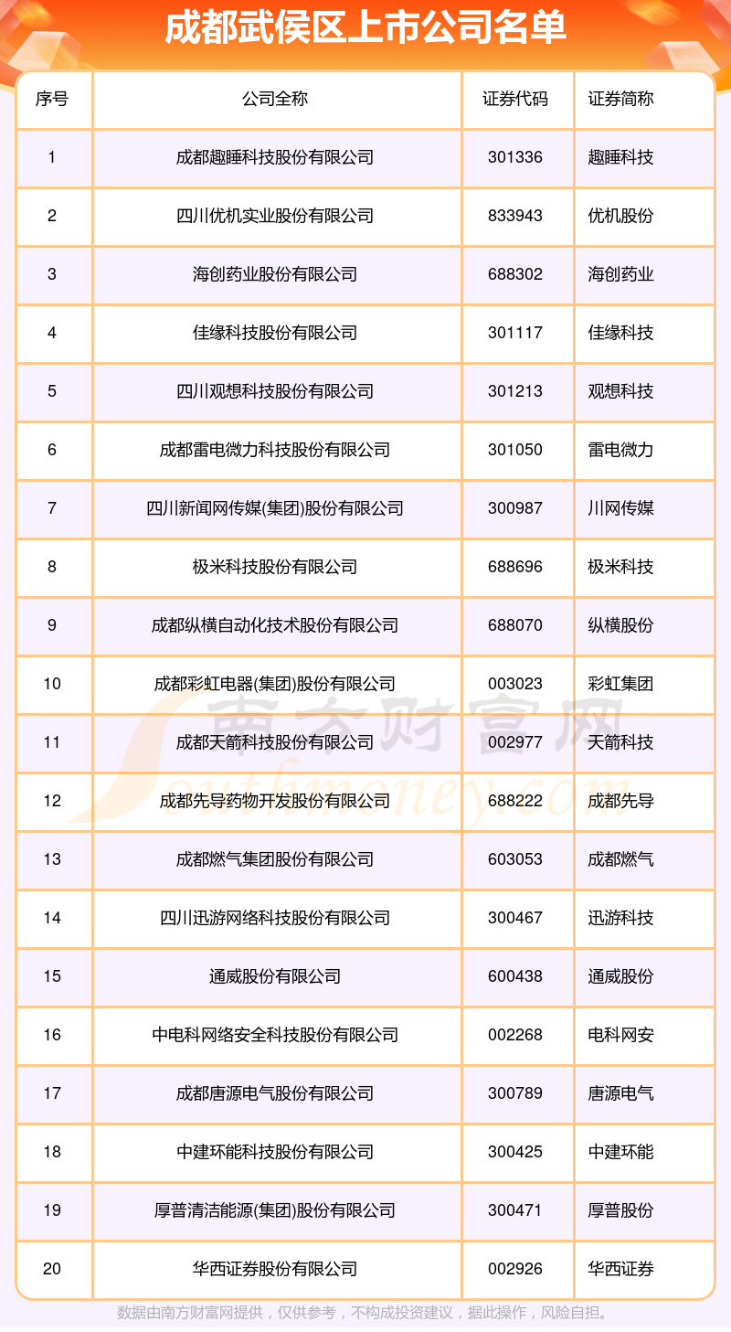 成都武侯區(qū)的上市公司都有哪些?南方財富網(wǎng)趨勢選股系統(tǒng)為您整理了歸屬于成都武侯區(qū),并且在A股上市的公司。