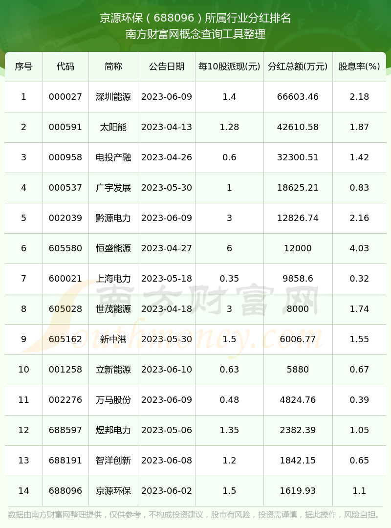按照南方財富網(wǎng)趨勢選股系統(tǒng)統(tǒng)計,京源環(huán)保所屬行業(yè)為電力行業(yè),電力行業(yè)分紅排名情況如下表: