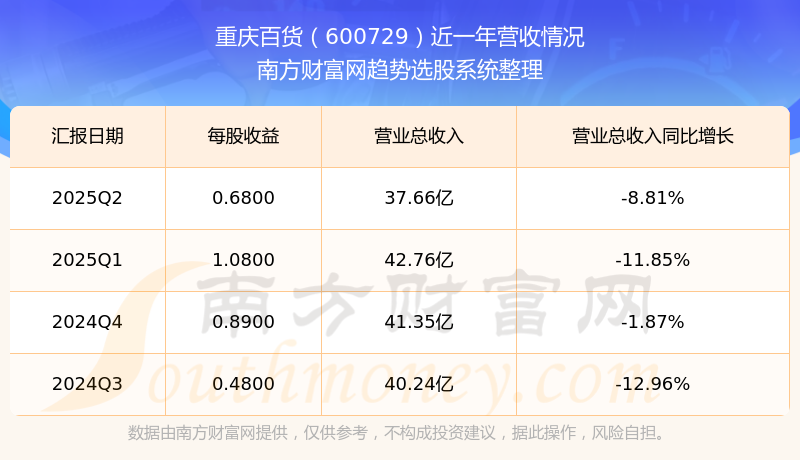 重慶百貨2025年第二季度顯示,公司主營(yíng)收入37.66億元,同比-8.81%;歸母凈利潤(rùn)2.99億元,同比7.96%;扣非凈利潤(rùn)2.76億元,同比6.48%。