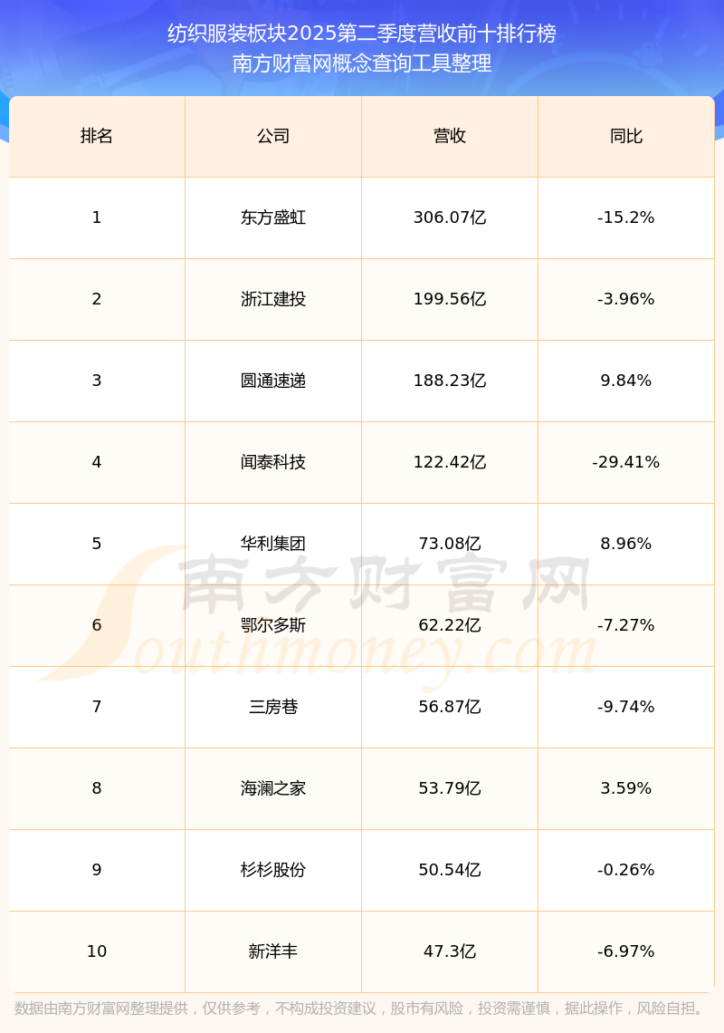 按照南方財(cái)富網(wǎng)概念查詢工具統(tǒng)計(jì),該股所屬板塊為紡織服裝板塊,該板塊共有155只股票,天創(chuàng)時(shí)尚2025第二季度營(yíng)收在該板塊中排名為第105名,該板塊2025第二季度營(yíng)收排名前十的股票如下表: