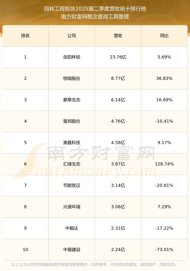 按照南方財(cái)富網(wǎng)概念查詢工具統(tǒng)計(jì),該股所屬板塊為園林工程板塊,該板塊共有34只股票,國(guó)晟科技2025第二季度營(yíng)收在該板塊中排名為第11名,該板塊2025第二季度營(yíng)收排名前十的股票如下表: