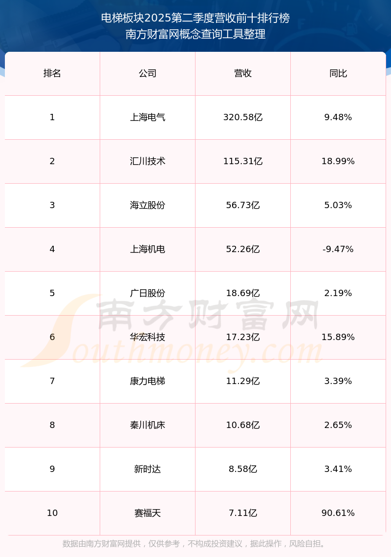 按照南方財(cái)富網(wǎng)概念查詢工具統(tǒng)計(jì),該股所屬板塊為電梯板塊,該板塊共有22只股票,廣日股份2025第二季度營收在該板塊中排名為第5名,該板塊2025第二季度營收排名前十的股票如下表: