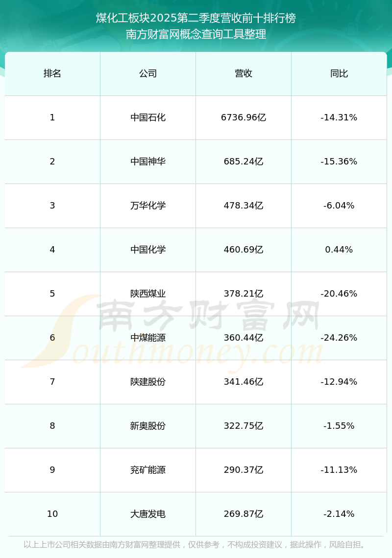 按照南方財富網(wǎng)概念查詢工具統(tǒng)計,該股所屬板塊為煤化工板塊,該板塊共有114只股票,陽煤化工2025第二季度營收在該板塊中排名為第49名,該板塊2025第二季度營收排名前十的股票如下表: