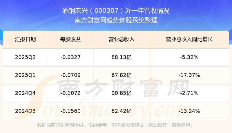 酒鋼宏興2025年第二季度公司實(shí)現(xiàn)營(yíng)業(yè)收入88.13億元,同比-5.32%;歸母凈利潤(rùn)-2.05億元,同比54.53%。
