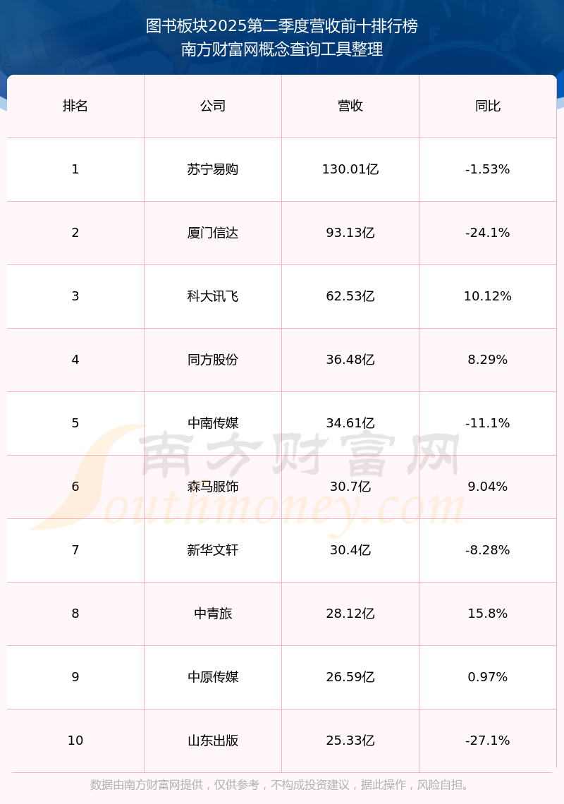 按照南方財富網概念查詢工具統(tǒng)計,該股所屬板塊為圖書板塊,該板塊共有62只股票,內蒙新華2025第二季度營收在該板塊中排名為第47名,該板塊2025第二季度營收排名前十的股票如下表: