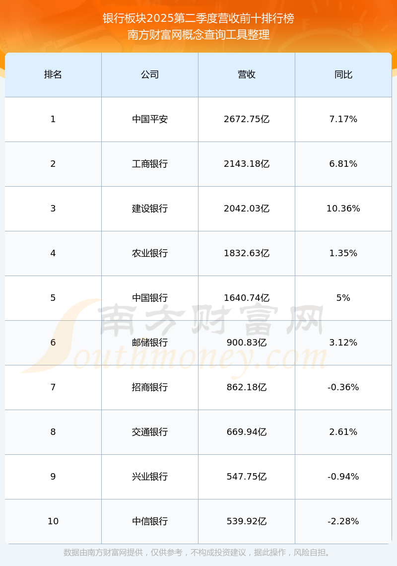 按照南方財富網(wǎng)概念查詢工具統(tǒng)計,該股所屬板塊為銀行板塊,該板塊共有44只股票,工商銀行2025第二季度營收在該板塊中排名為第2名,該板塊2025第二季度營收排名前十的股票如下表: