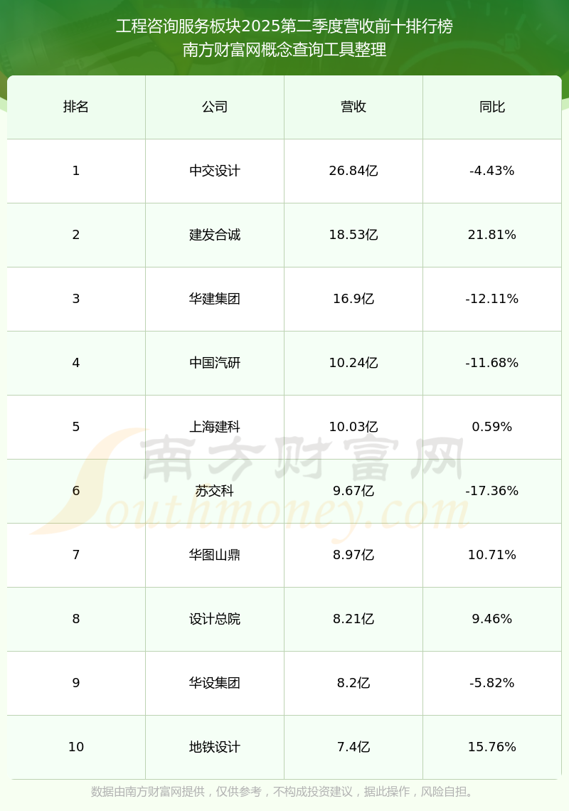 按照南方財(cái)富網(wǎng)概念查詢工具統(tǒng)計(jì),該股所屬板塊為工程咨詢服務(wù)板塊,該板塊共有39只股票,中衡設(shè)計(jì)2025第二季度營(yíng)收在該板塊中排名為第18名,該板塊2025第二季度營(yíng)收排名前十的股票如下表: