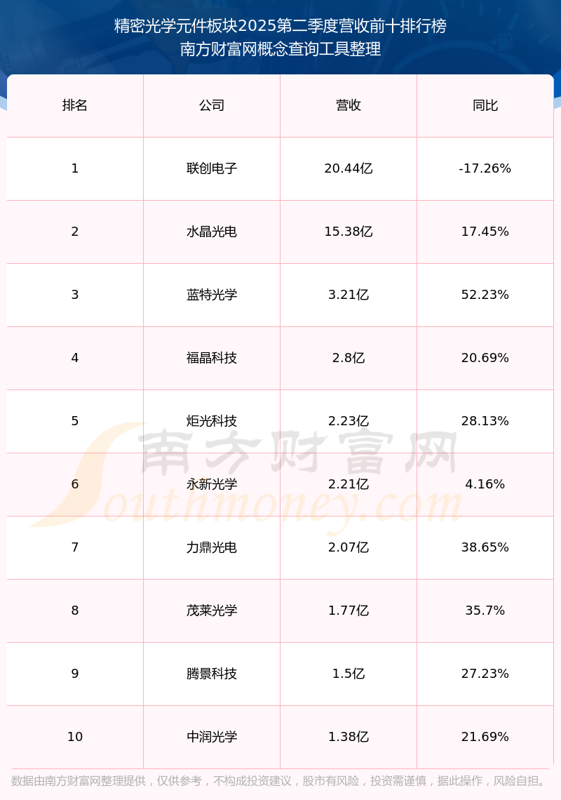 按照南方財富網(wǎng)概念查詢工具統(tǒng)計,該股所屬板塊為精密光學(xué)元件板塊,該板塊共有12只股票,騰景科技2025第二季度營收在該板塊中排名為第9名,該板塊2025第二季度營收排名前十的股票如下表: