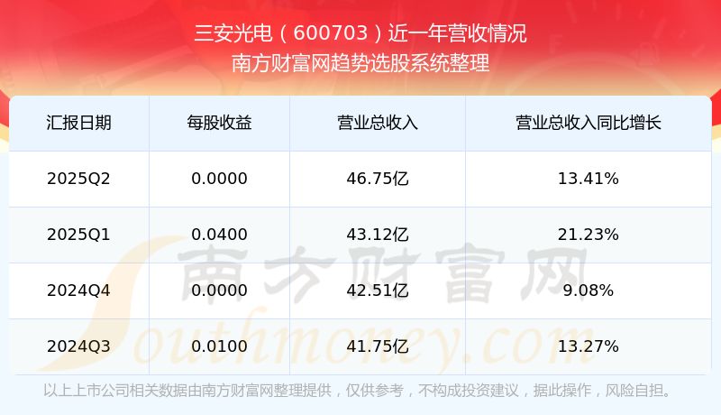 財報顯示,2025年第二季度三安光電營收46.75億元,同比增長13.41%,凈利潤-3542.29萬元,同比增長-154.04%。