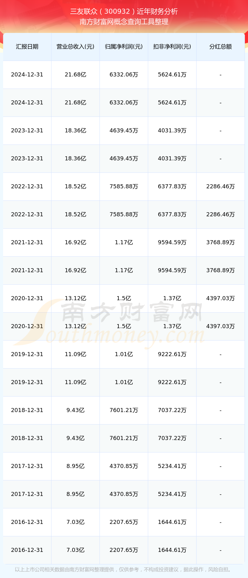近年三友聯(lián)眾分紅派息情況如下表所示: