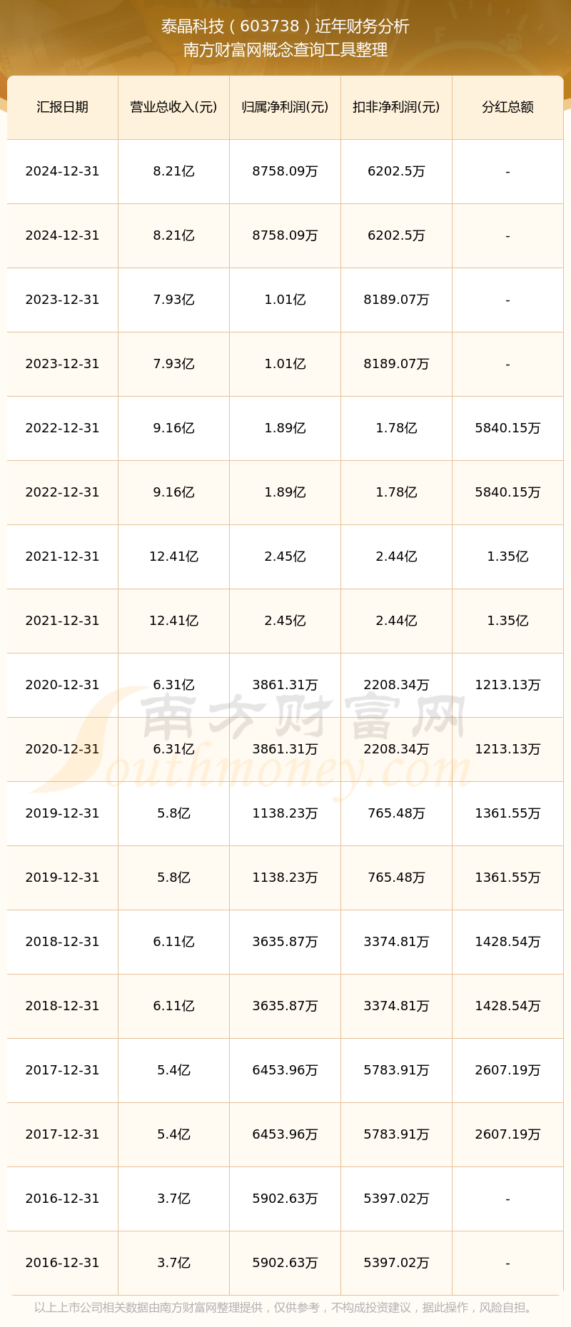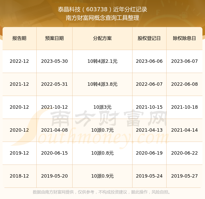 泰晶科技?xì)v年分紅派息情況如下表所示: