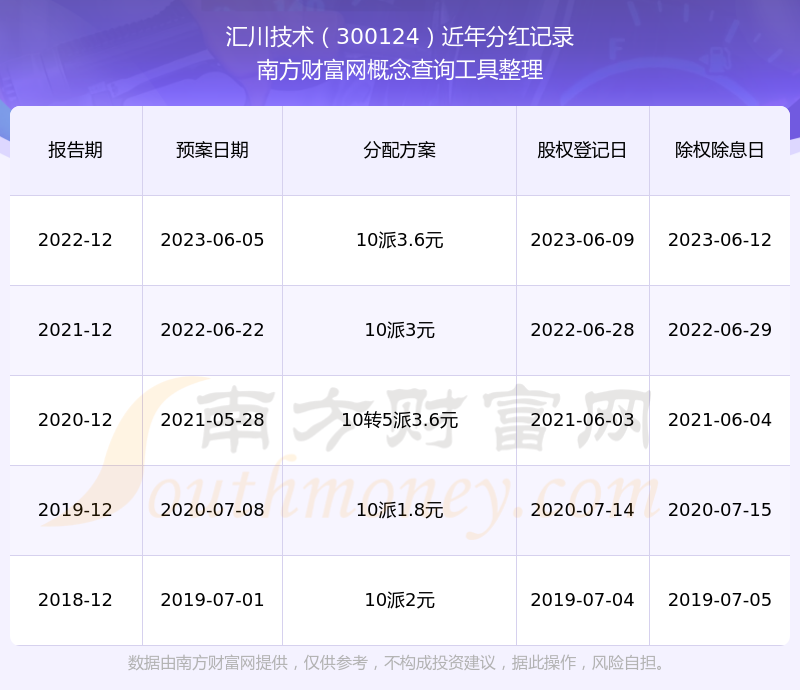 匯川技術(shù)最新一次公布的分紅方案為10派3.6元。本次權(quán)益分派股權(quán)登記日為2023年6月9日,除權(quán)除息日為2023年6月12日,派息日為2023年6月12日。