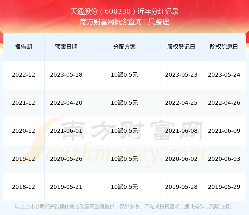 天通股份最新一次公布的分紅方案為10派0.5元。本次權(quán)益分派股權(quán)登記日為2023年5月23日,除權(quán)除息日為2023年5月24日,派息日為2023年5月24日。