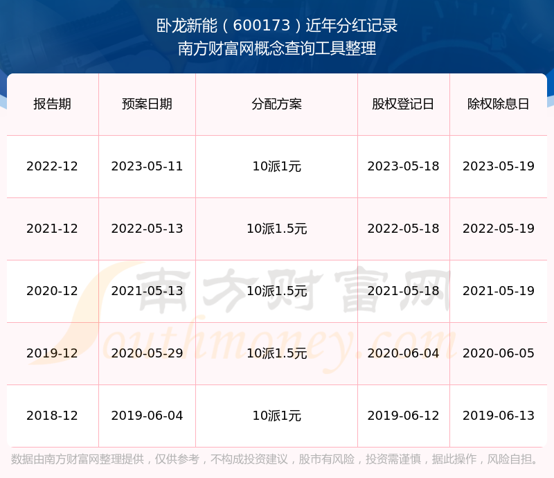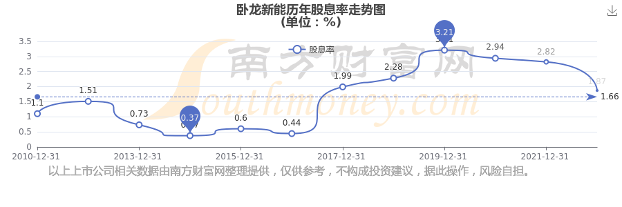 臥龍新能最新一次公布的分紅方案為10派1元。本次權益分派股權登記日為2023年5月18日,除權除息日為2023年5月19日,派息日為2023年5月19日。
