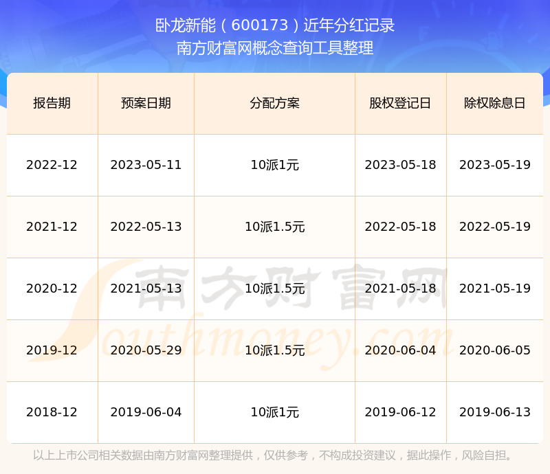 臥龍新能最新一次公布的分紅方案為10派1元。本次權(quán)益分派股權(quán)登記日為2023年5月18日,除權(quán)除息日為2023年5月19日,派息日為2023年5月19日。