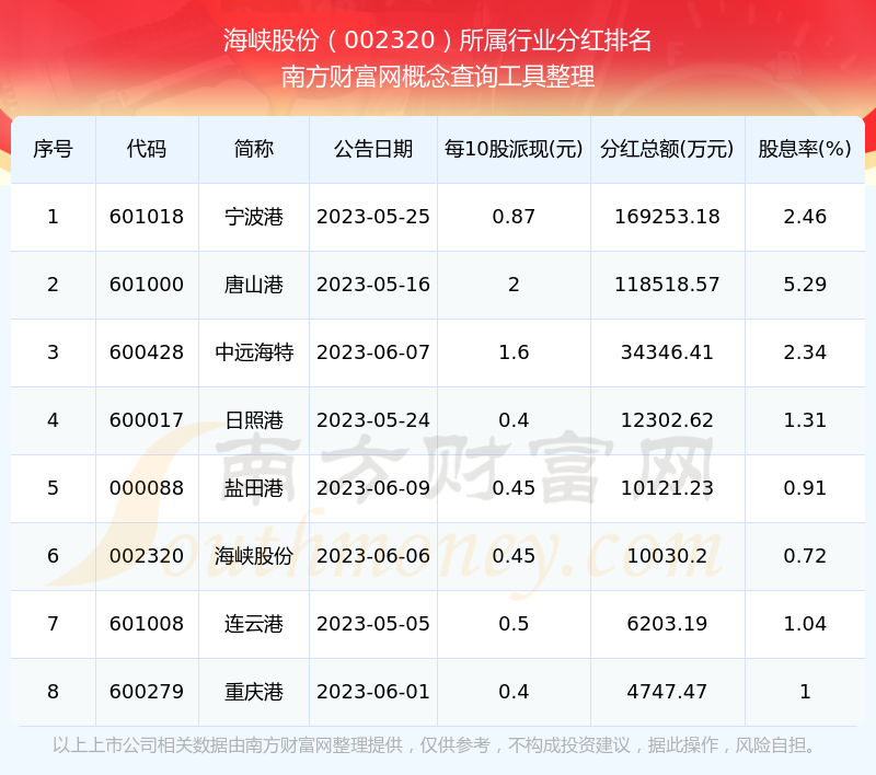 按照南方財富網(wǎng)趨勢選股系統(tǒng)統(tǒng)計,海峽股份所屬行業(yè)為航運(yùn)港口行業(yè),航運(yùn)港口行業(yè)分紅排名情況如下表: