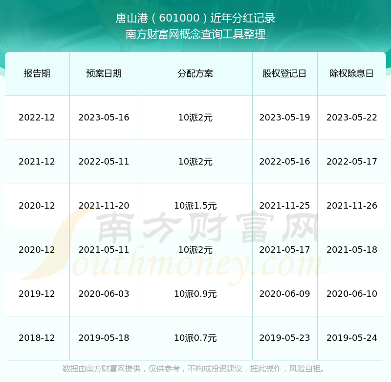 唐山港最新一次公布的分紅方案為10派2元。本次權(quán)益分派股權(quán)登記日為2023年5月19日,除權(quán)除息日為2023年5月22日,派息日為2023年5月22日。
