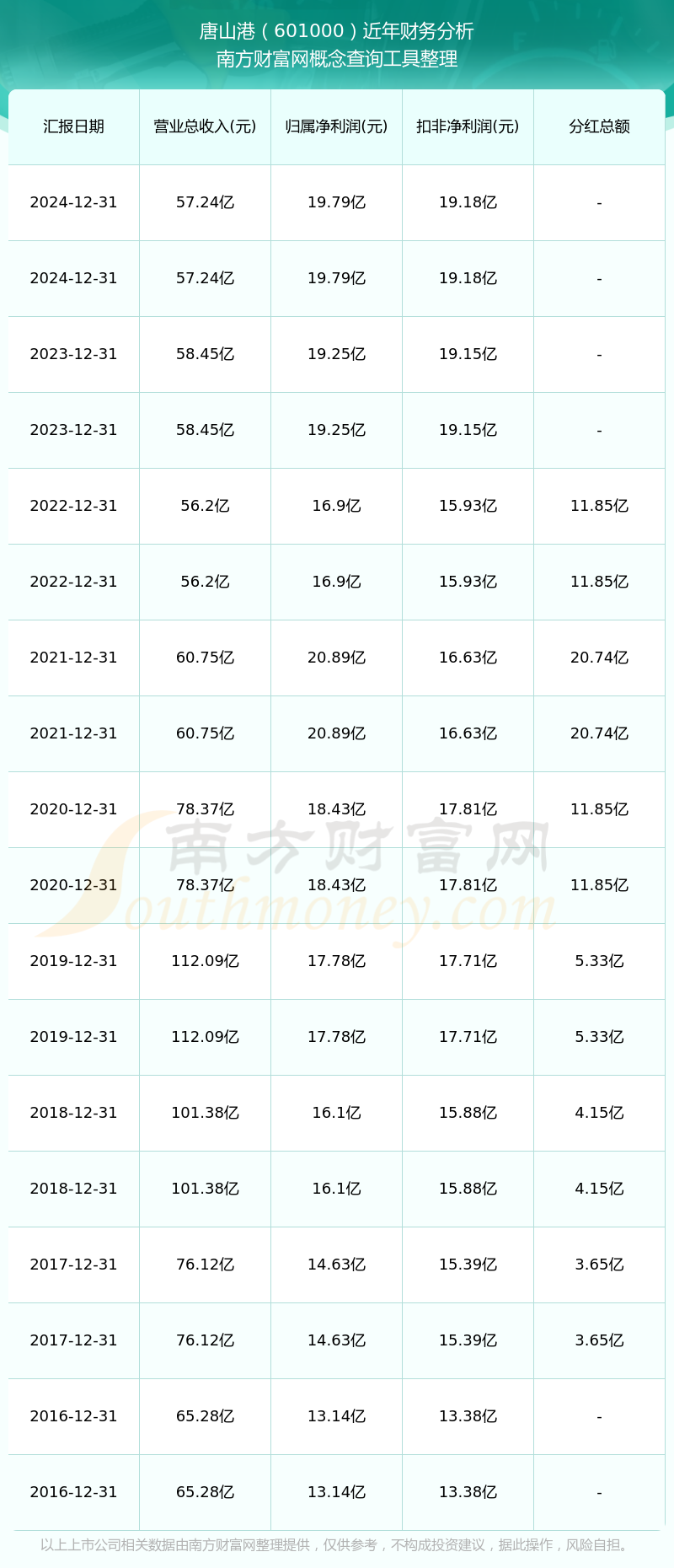 唐山港公司2024年實現(xiàn)營收57.24億元,凈利潤19.79億元,毛利率46.65%。