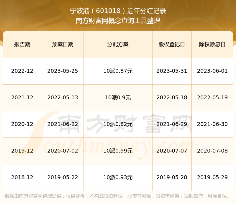 寧波港最新一次公布的分紅方案為10派0.87元。本次權(quán)益分派股權(quán)登記日為2023年5月31日,除權(quán)除息日為2023年6月1日,派息日為2023年6月1日。
