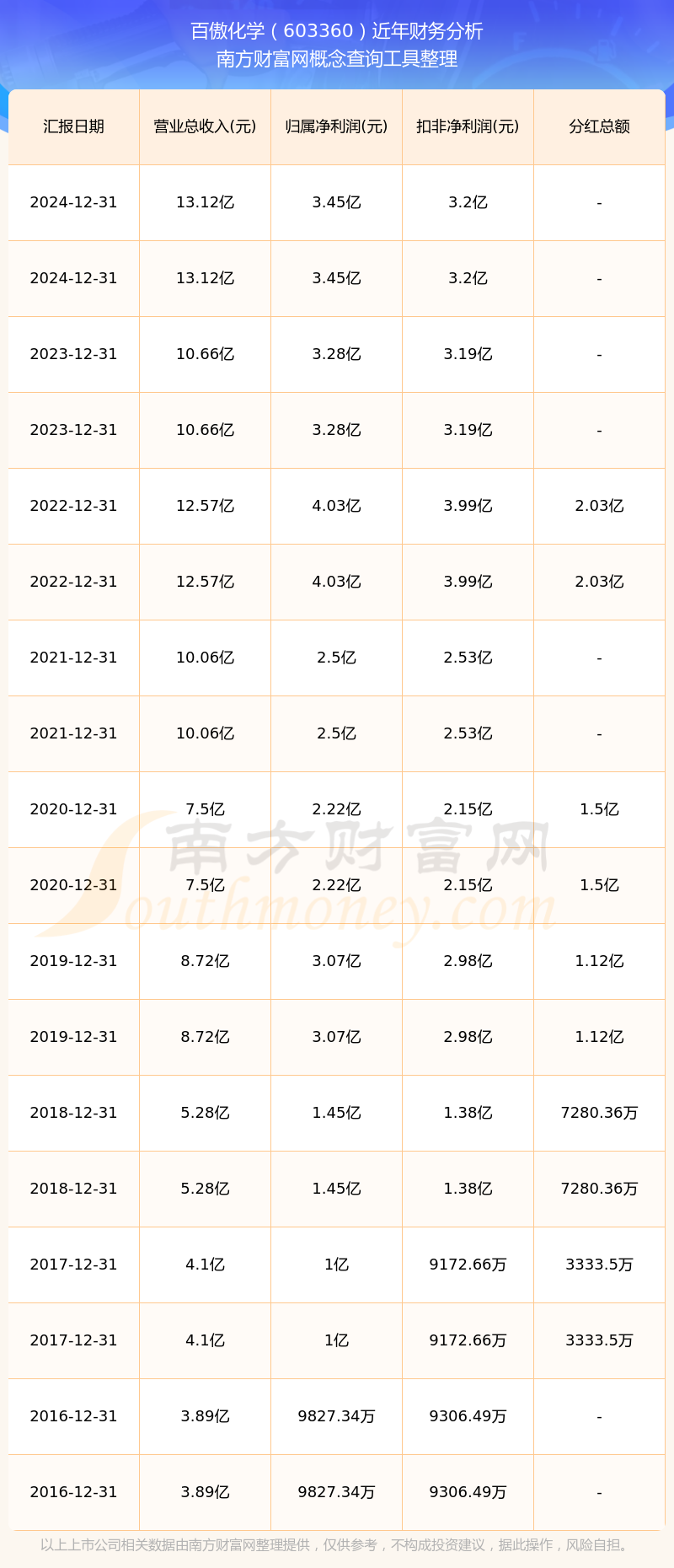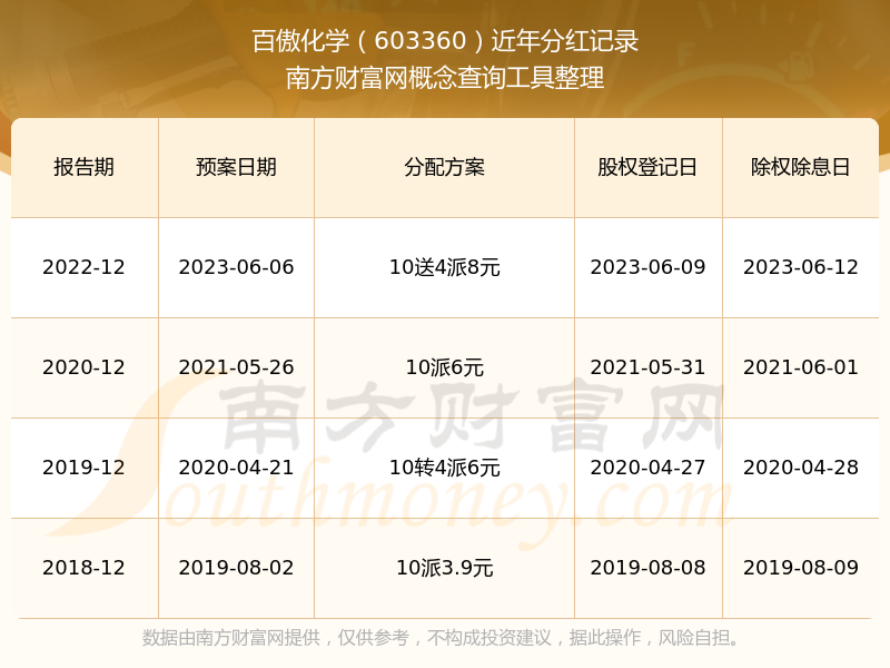 百傲化學(xué)歷年分紅派息情況如下表所示: