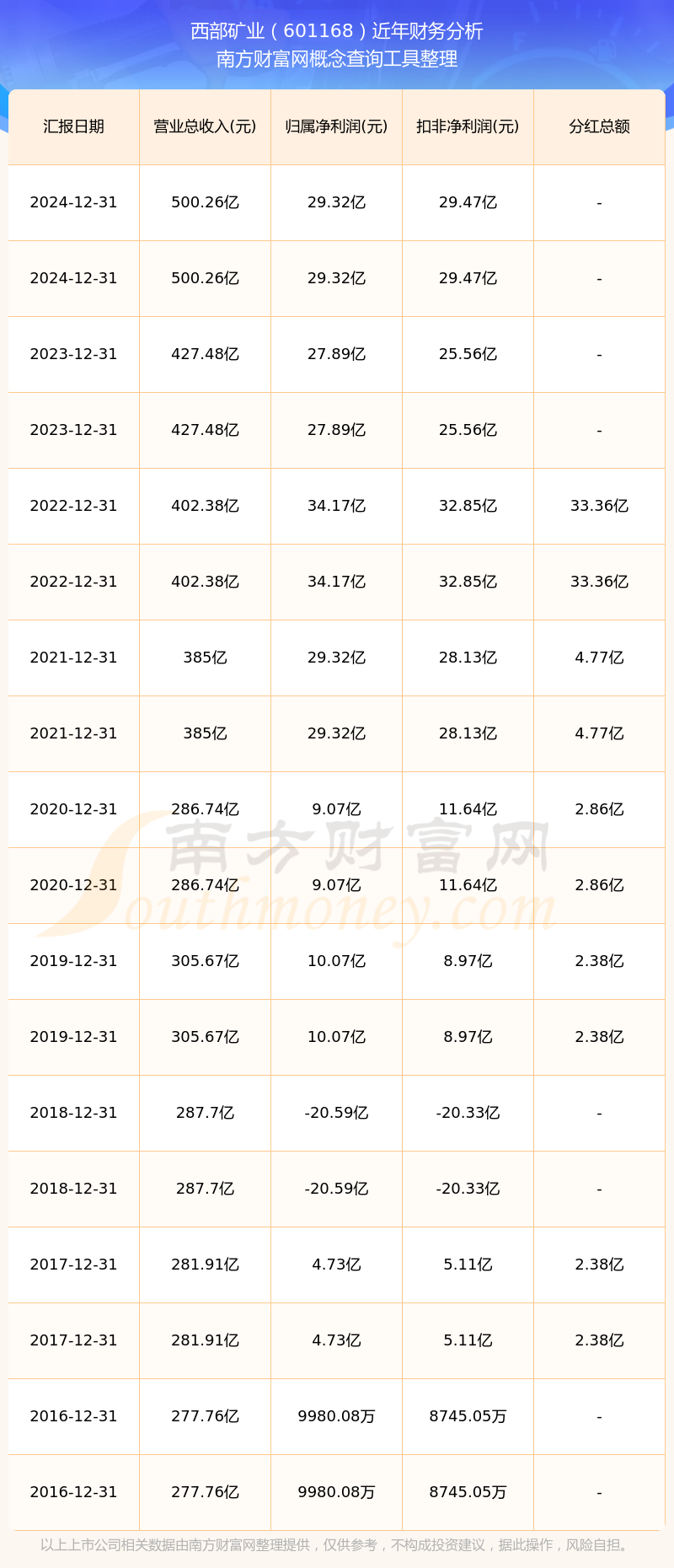 2024年報(bào)顯示,西部礦業(yè)實(shí)現(xiàn)營收500.26億,同比增長17.02%;凈利潤29.32億,同比增長5.1%;毛利率19.9%。