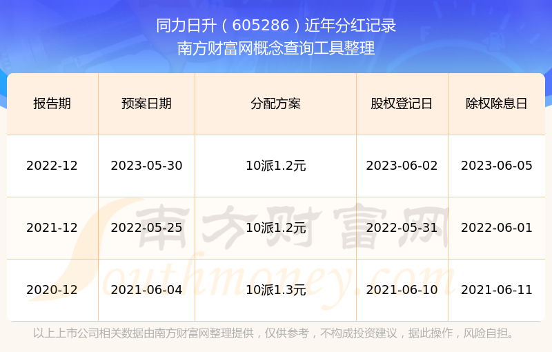 同力日升最新一次公布的分紅方案為10派1.2元。本次權(quán)益分派股權(quán)登記日為2023年6月2日,除權(quán)除息日為2023年6月5日,派息日為2023年6月5日。