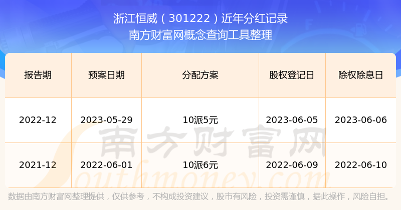 浙江恒威最新一次公布的分紅方案為10派5元。本次權益分派股權登記日為2023年6月5日,除權除息日為2023年6月6日,派息日為2023年6月6日。