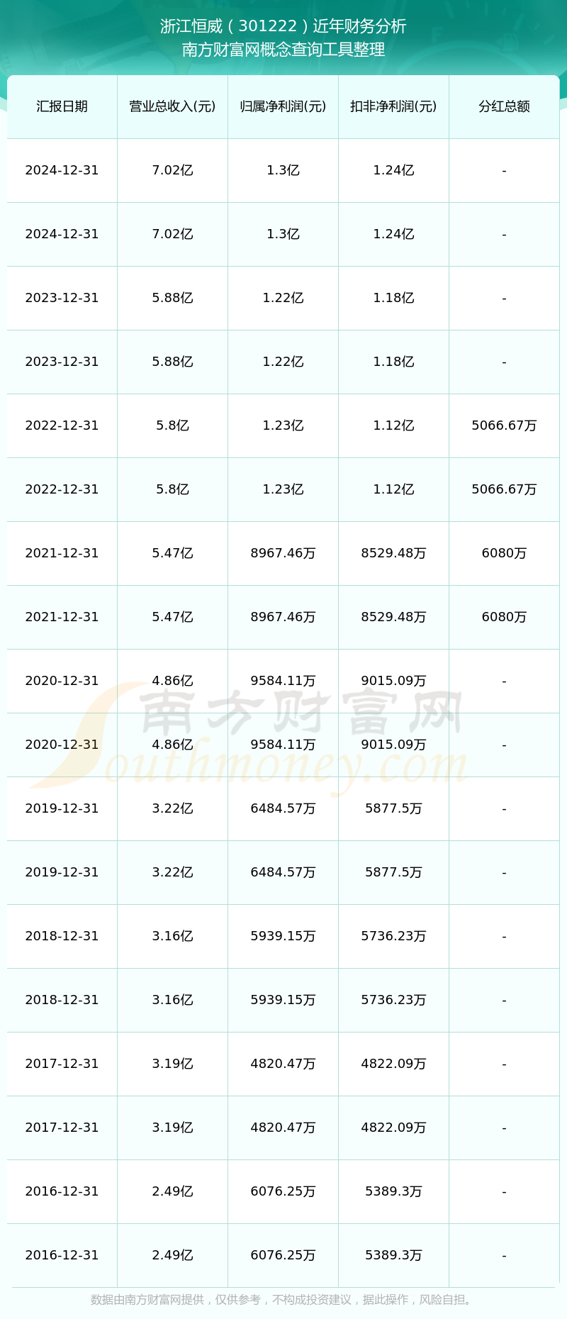 浙江恒威歷年分紅派息情況如下表所示: