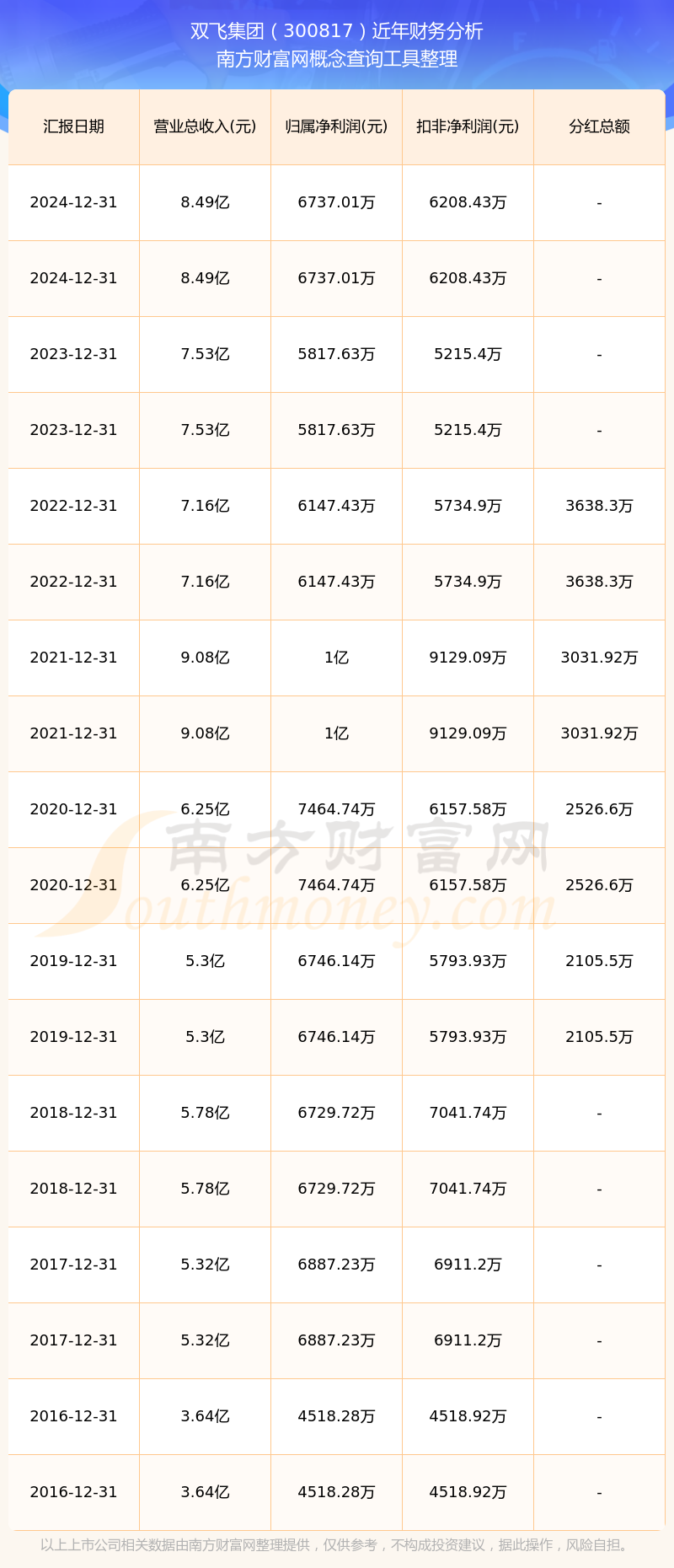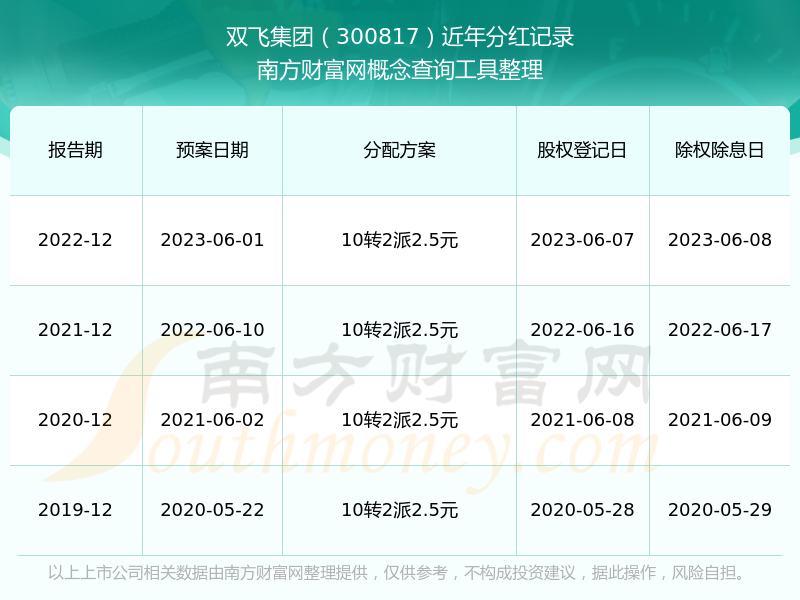 雙飛集團最新一次公布的分紅方案為10轉(zhuǎn)2派2.5元。本次權(quán)益分派股權(quán)登記日為2023年6月7日,除權(quán)除息日為2023年6月8日,派息日為2023年6月8日。