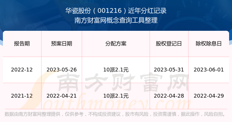 華瓷股份最新一次公布的分紅方案為10派2.1元。本次權(quán)益分派股權(quán)登記日為2023年5月31日,除權(quán)除息日為2023年6月1日,派息日為2023年6月1日。