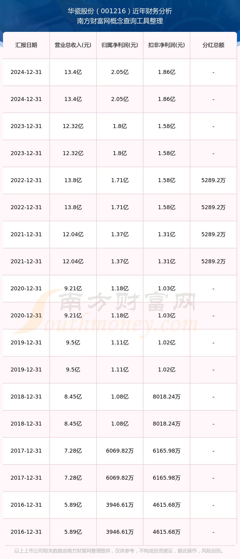 華瓷股份歷年分紅派息情況如下表所示: