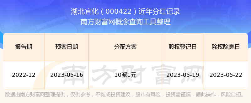 湖北宜化最新一次公布的分紅方案為10派1元。本次權(quán)益分派股權(quán)登記日為2023年5月19日,除權(quán)除息日為2023年5月22日,派息日為2023年5月22日。