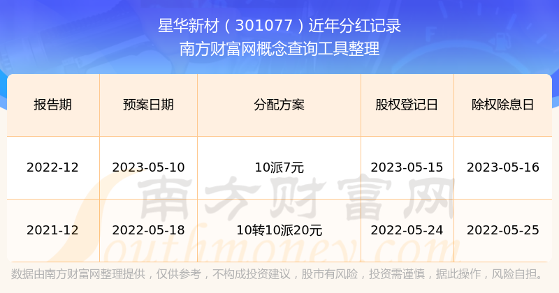 星華新材最新一次公布的分紅方案為10派7元。本次權(quán)益分派股權(quán)登記日為2023年5月15日,除權(quán)除息日為2023年5月16日,派息日為2023年5月16日。