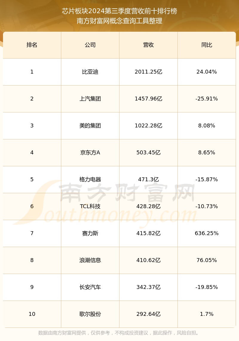 按照南方財(cái)富網(wǎng)概念查詢工具統(tǒng)計(jì),該股所屬板塊為芯片板塊,該板塊共有552只股票,燦芯股份2024第三季度營收在該板塊中排名為第552名,該板塊2024第三季度營收排名前十的股票如下表: