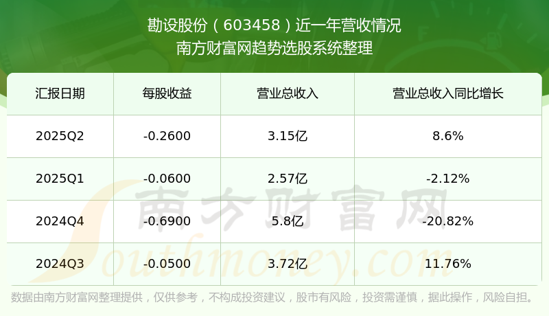 勘設(shè)股份(603458)披露2025年第二季度報告,報告期實現(xiàn)營收3.15億元,同比8.6%;歸母凈利潤-7772.17萬元,同比-59.28%;扣非凈利潤-7826.01萬元,同比-63.59%;基本每股收益-0.26元。
