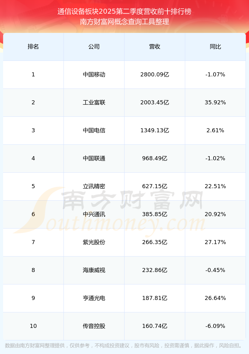 按照南方財(cái)富網(wǎng)概念查詢工具統(tǒng)計(jì),該股所屬板塊為通信設(shè)備板塊,該板塊共有163只股票,長(zhǎng)飛光纖2025第二季度營(yíng)收在該板塊中排名為第23名,該板塊2025第二季度營(yíng)收排名前十的股票如下表: