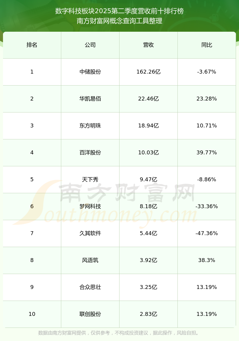 按照南方財(cái)富網(wǎng)概念查詢工具統(tǒng)計(jì),該股所屬板塊為數(shù)字科技板塊,該板塊共有18只股票,風(fēng)語筑2025第二季度營收在該板塊中排名為第8名,該板塊2025第二季度營收排名前十的股票如下表: