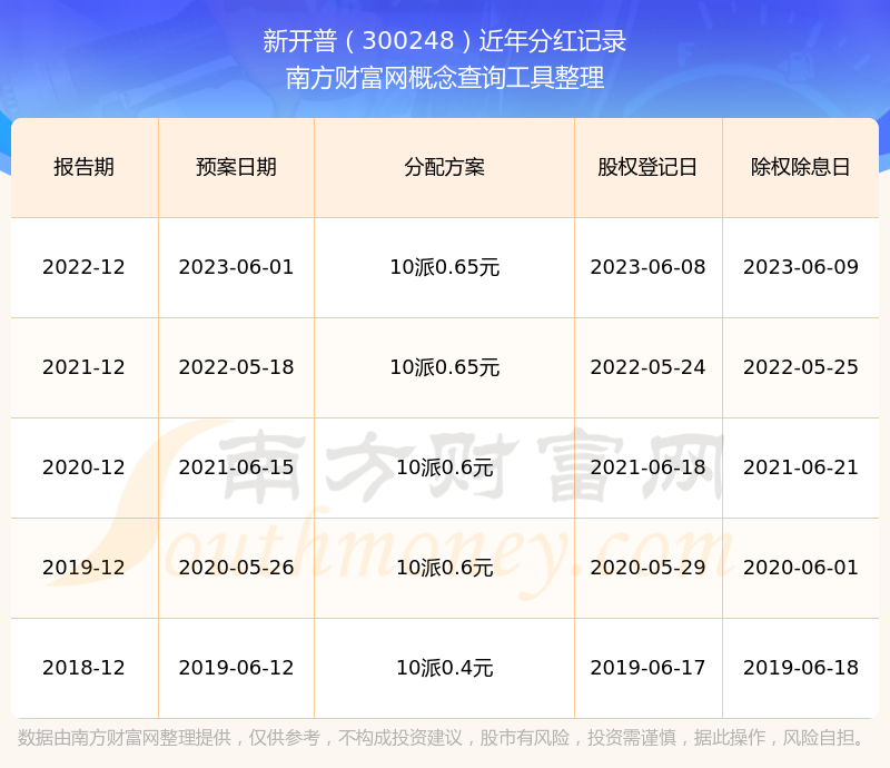 新開普最新一次公布的分紅方案為10派0.65元。本次權益分派股權登記日為2023年6月8日,除權除息日為2023年6月9日,派息日為2023年6月9日。